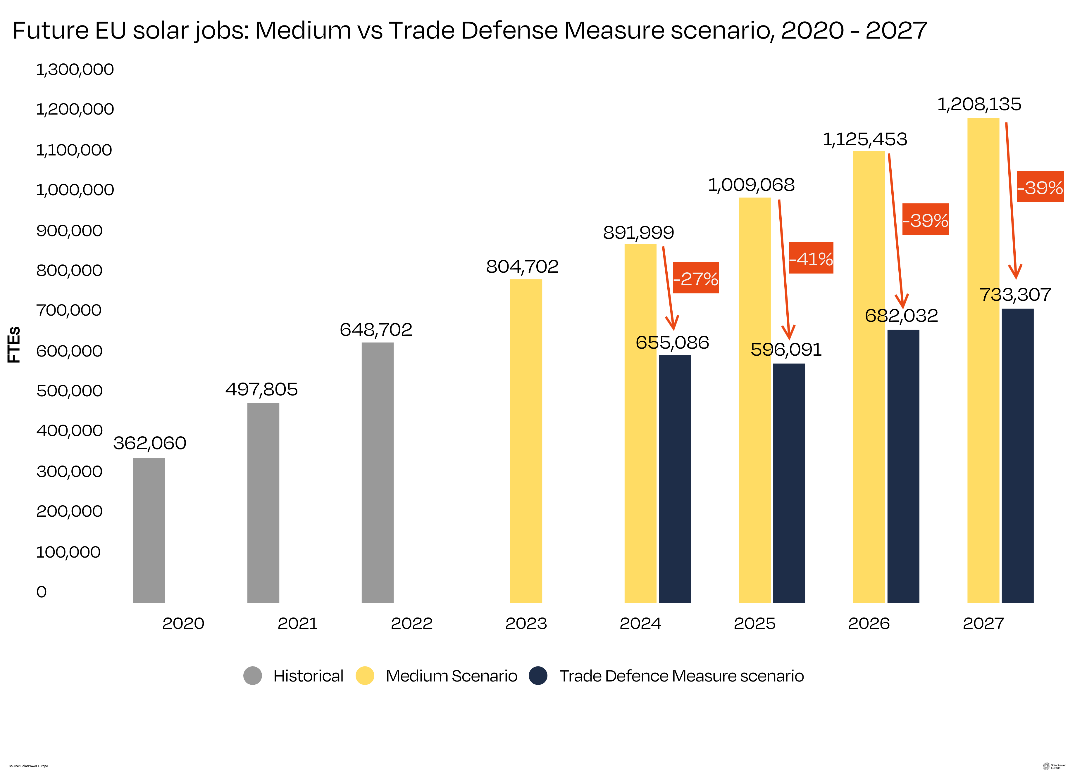 The joint statement warns that trade defence measures would negatively impact European employment and put many local, green, jobs at risk. Should trade defence measures be investigated next year, and implemented in 2025, our latest analysis suggests a drop from 890,000 to 655,000 jobs in 2024, and down to less than 600,000 in 2025.